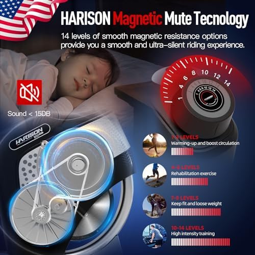 【Ultra Silent Recumbent Bike】This HARISON recumbent exercise bike employs magnetic resistance technology to provide you a whisper-quiet, joint-friendly workout, eliminating any potential disturbances to your surroundings. Ideal for diverse needs – 1-3 levels for warming up, 4-6 levels for rehabilitation, 7-9 levels for body shaping, 10-14 levels for muscle building.