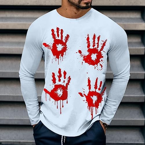 SKRK Shirt White Men’s Halloween Horn Print T Shirt Long Sleeve Crew Neck Top T Shirt Shirt White