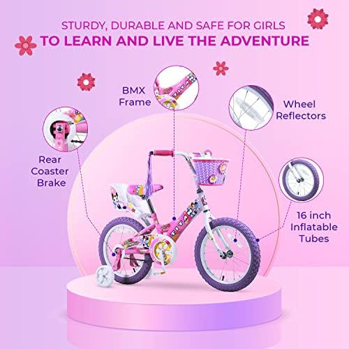 Girls 16-inch Pink BMX. The only girls bike that includes a doll seat, a basket, streamers, and training wheels